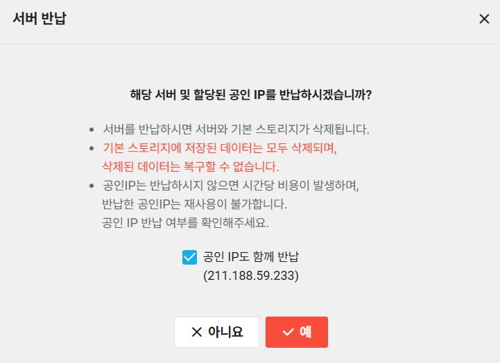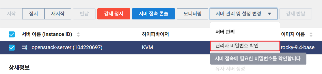 생성한 서버를 확인한 후 "서버 관리 및 설정 변경" > 관리자 비밀번호 확인 클릭