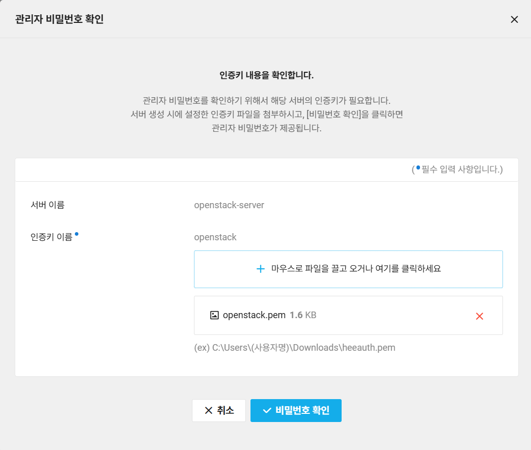 서버 생성 시 발급받은 인증키를 업로드 후 패스워드를 확인한다.