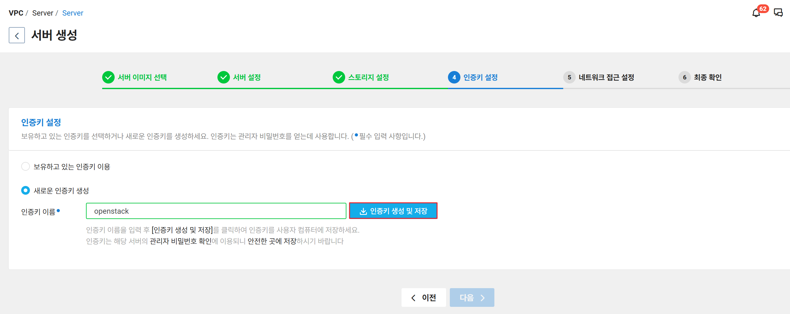 서버 접속 시 필요한 인증키를 생성 후 다운로드 받는다.