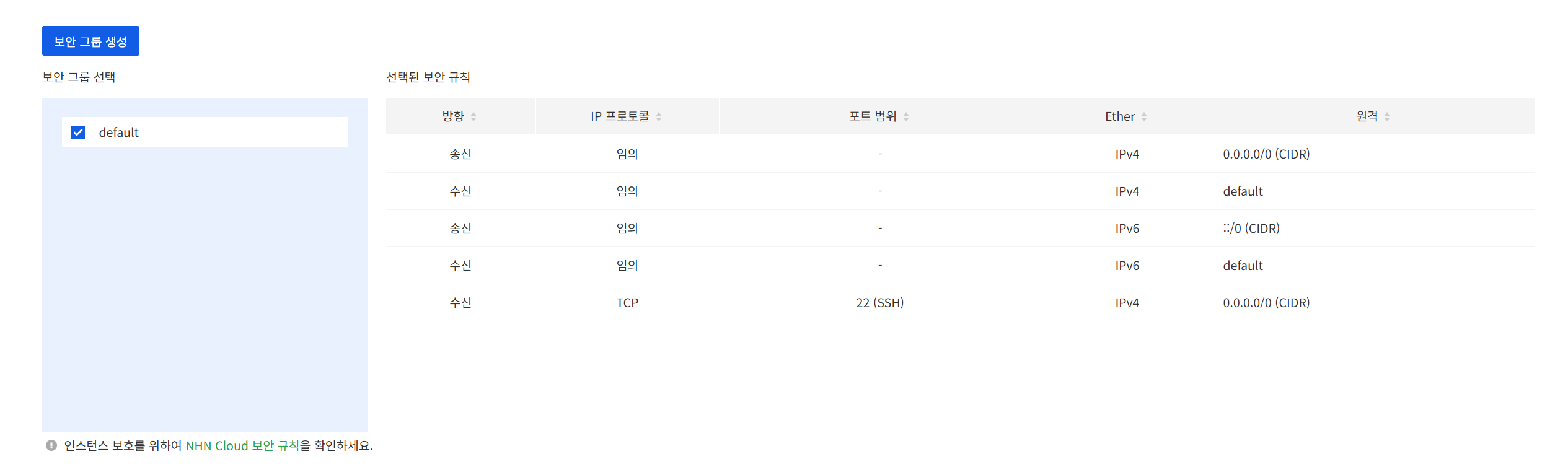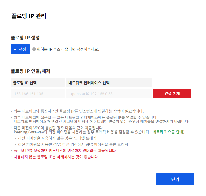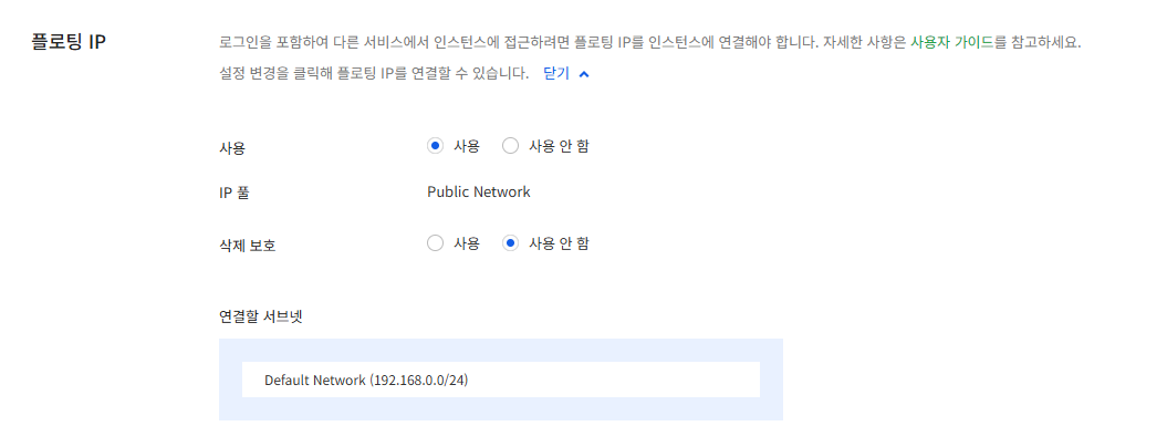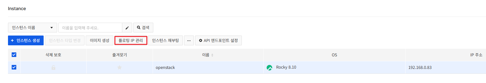 - 외부에서 생성한 인스턴스로 접근하기 위해선 플로팅 IP 설정이 필요하다.