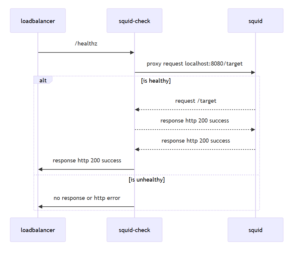 ALB 에서 squid-check 로 health check 요청을 보내면 squid-check 는 squid proxy 가 실행되고 있을 경우 200 을 응답하고, squid proxy 가 실행되고 있지 않을 경우 응답하지 않는다.