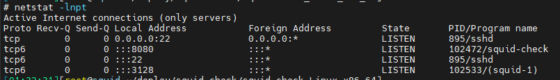 squid-check 는 8080 으로 실행되며, squid 3128 으로 squid proxy 가 실행되고 있는 지 확인한다.