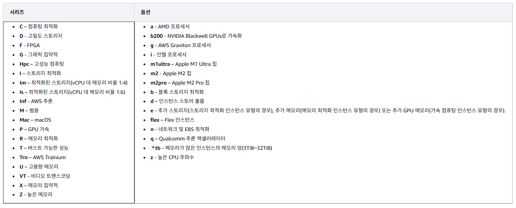 [인스턴스 명명규칙] https://docs.aws.amazon.com/ko_kr/ec2/latest/instancetypes/instance-type-names.html