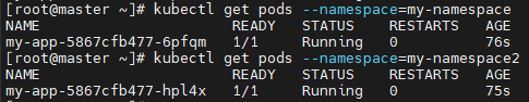 [root@master ~]# kubectl create deployment my-app --image=nginx --namespace=my-namespace
