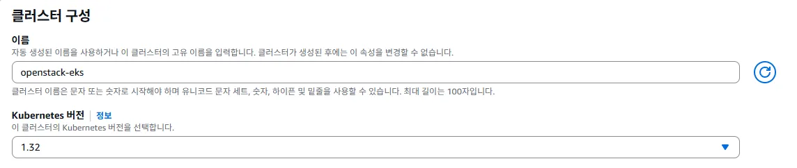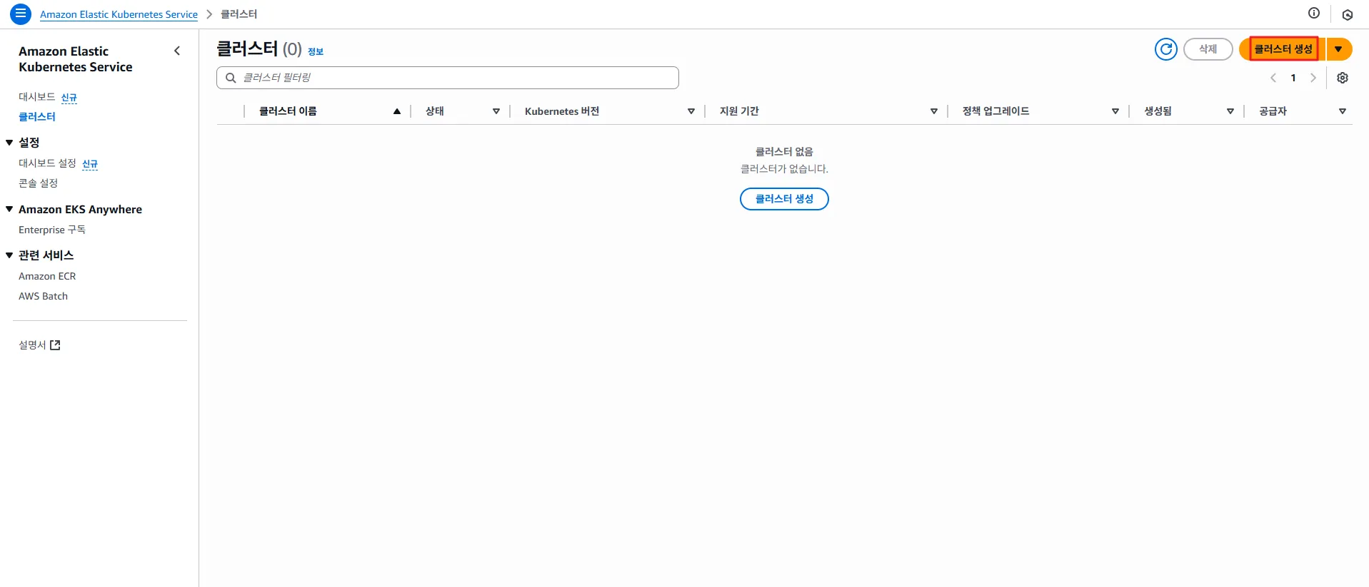 Amazon Console 접속 > EKS 서비스 이동 > 클러스터 생성 클릭