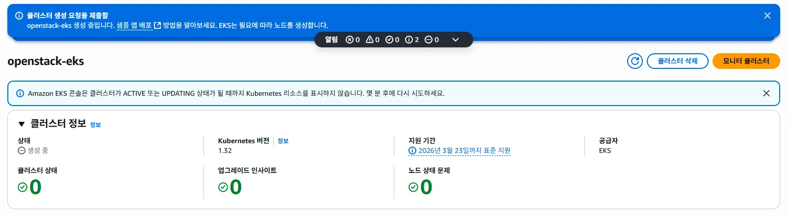 해당 VPC 의 DNS 옵션 2개 모두 활성화가 필요하다. (DNS 호스트 이름, DNS 확인) 클러스터 생성을 클릭한 후 10~20분 정도 기다리면 클러스터 생성이 완료된다.