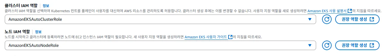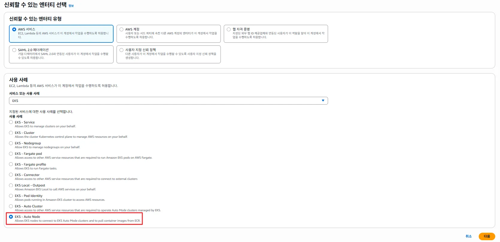 노드 IAM 권장 역할의 권한은 ‘Auto Mode’ 노드가 컨테이너의 ECR 이미지를 검색할 수 있는 권한을 포함한 클러스터에 연결하는 데 필요한 권한이다.