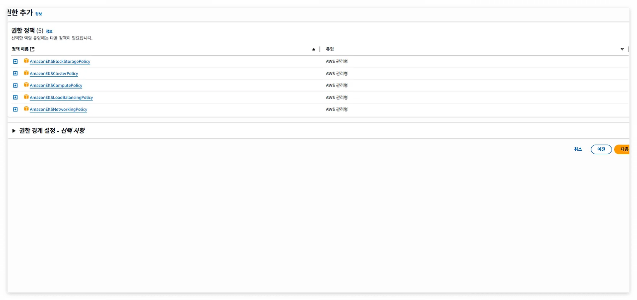 클러스터 IAM 권장 역할의 권한은 ‘EKS Auto Mode’ 가 EC2 Instance, EBS Volume, EC2 LoadBalancer 등의 리소스를 관리하는 데 필요한 권한이다. - 노드 IAM 역할