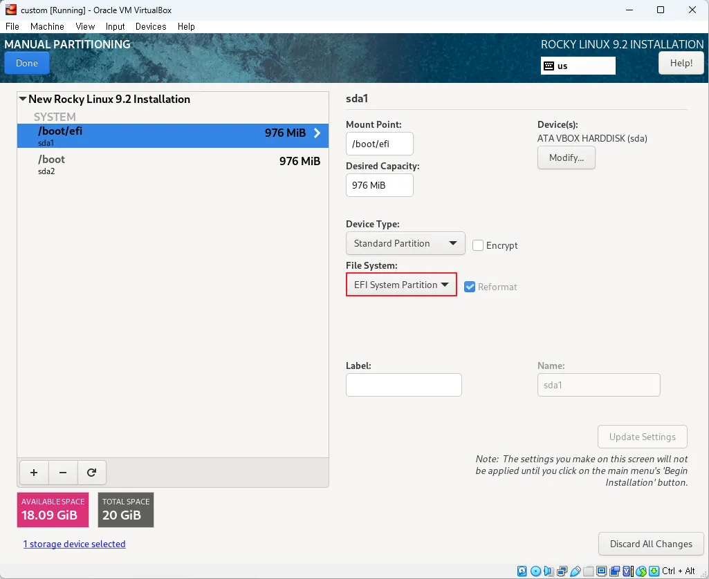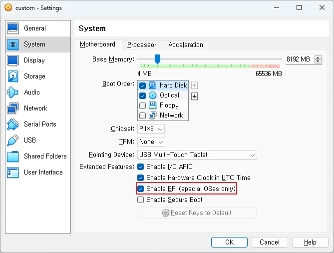 VirtualBox 로 리눅스 설치 시, Enable EFI 옵션으로 펌웨어를 UEFI 로 설정한다.
