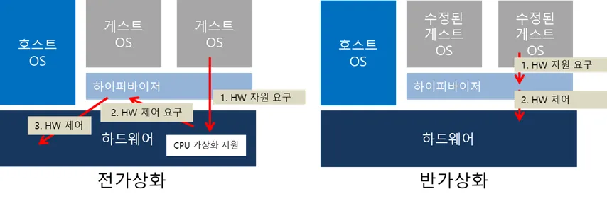 전가상화 방식은 모든 CPU 명령어를 에뮬레이트하며, 반가상화 방식은 꼭 필요한 명령어만 가상화합니다.