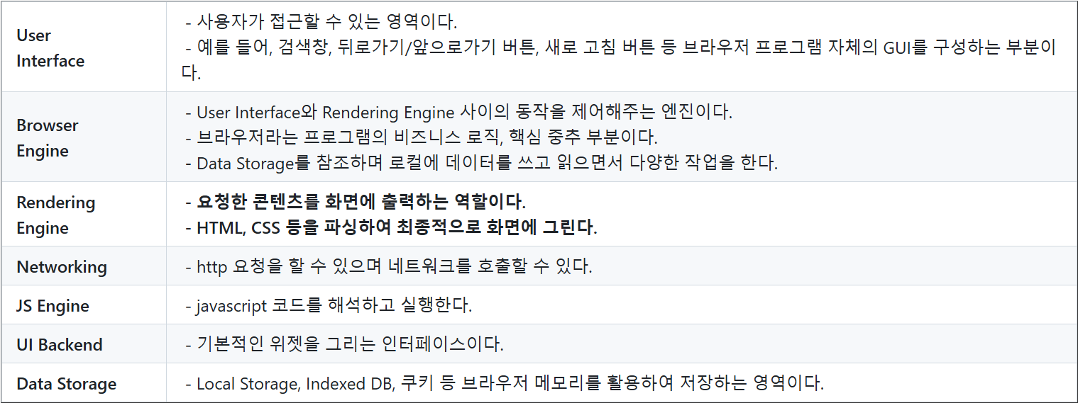 서버에서 받은 문서(HTML, CSS, JavaScript)를 해석하고 실행하여 화면에 표현하기 위한 해석기(Parser)들을 가지고 있다.