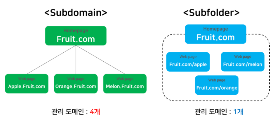 - '서브 도메인'방식과 '서브 폴더'방식이 있으며, 서브 도메인은 웹 페이지들을 하위 도메인으로 확장 관리한다.