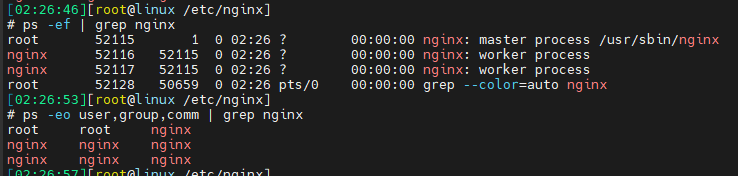 nginx 실행 시 worker process 의 user, group 의 소유권이 nginx 인 것을 확인할 수 있다.