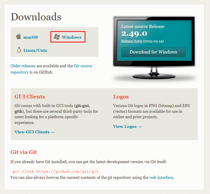 Downloads macOS Windows Linux/Unix Older releases are available and the Git source repository is on GitHub. Latest source Release 2.49.0 Release Notes (2025-03-14) Download Source Code GUI Clients Git comes with built-in GUI tools (git-gui, gitk), but ther